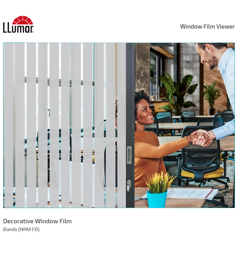 De LLumar NRM FB SR HPR is een matte designfolie met geïntegreerde frost-banden die glasoppervlakken een duidelijke en professionele zonering geven. Deze uitvoering biedt privacy op strategische hoogtes, terwijl de ruimte visueel open blijft.